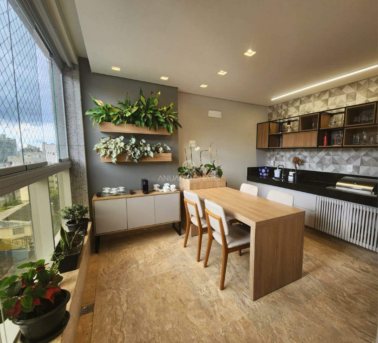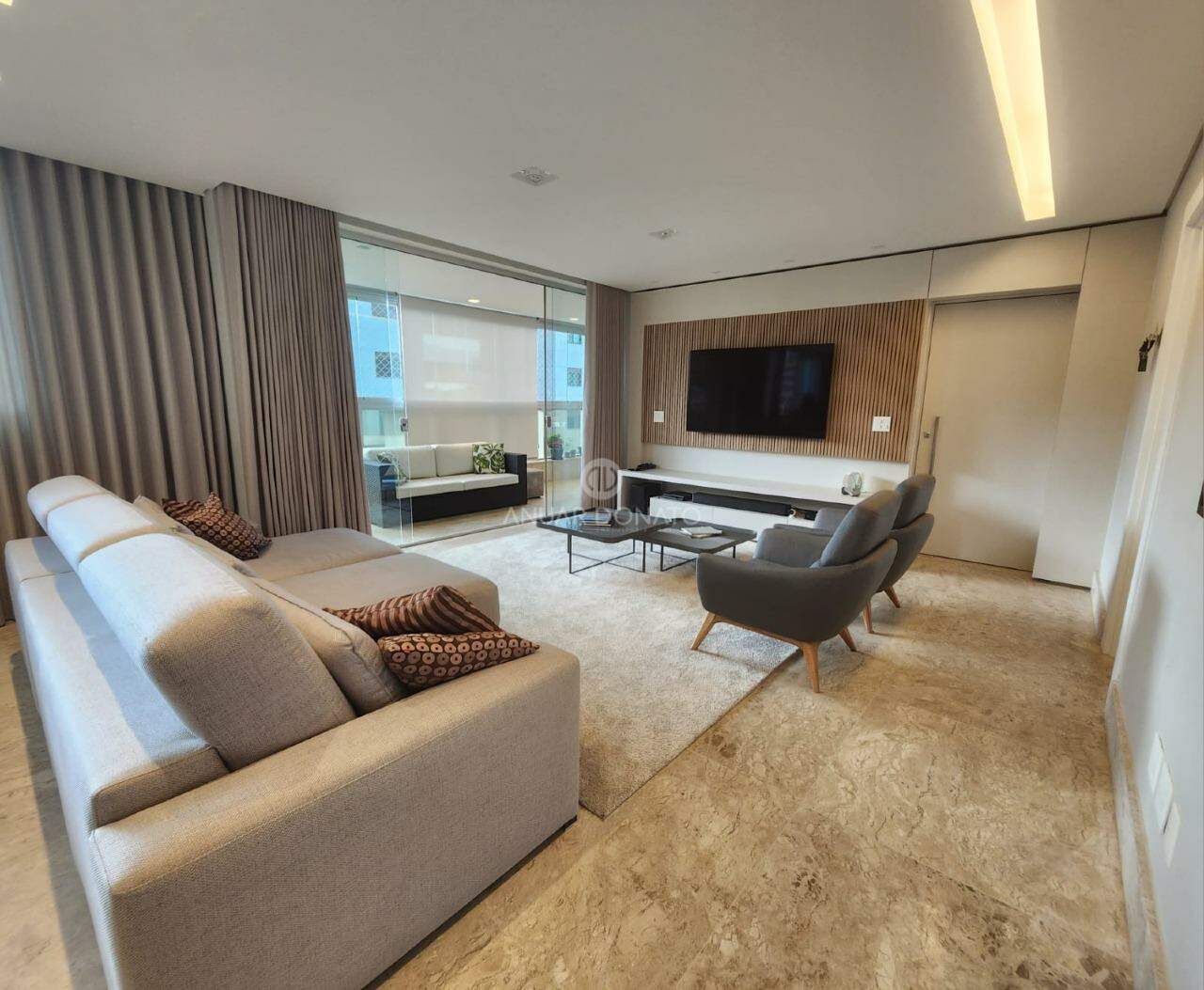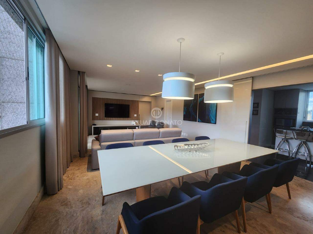 Apartamento: Área útil aproximada: 197,15 m². Salão amplo com varanda gourmet, lavabo, piso em pedra Martha Rocha, 04 quartos (sendo 02 suítes e 02 semi suítes), suíte master com closet e todos os quartos com armários da L'Idea. Rouparia, 03 banhos (02 suítes e 01 social), com espelhos e box. Cozinha com armários, despensa, área de serviço e DCE.