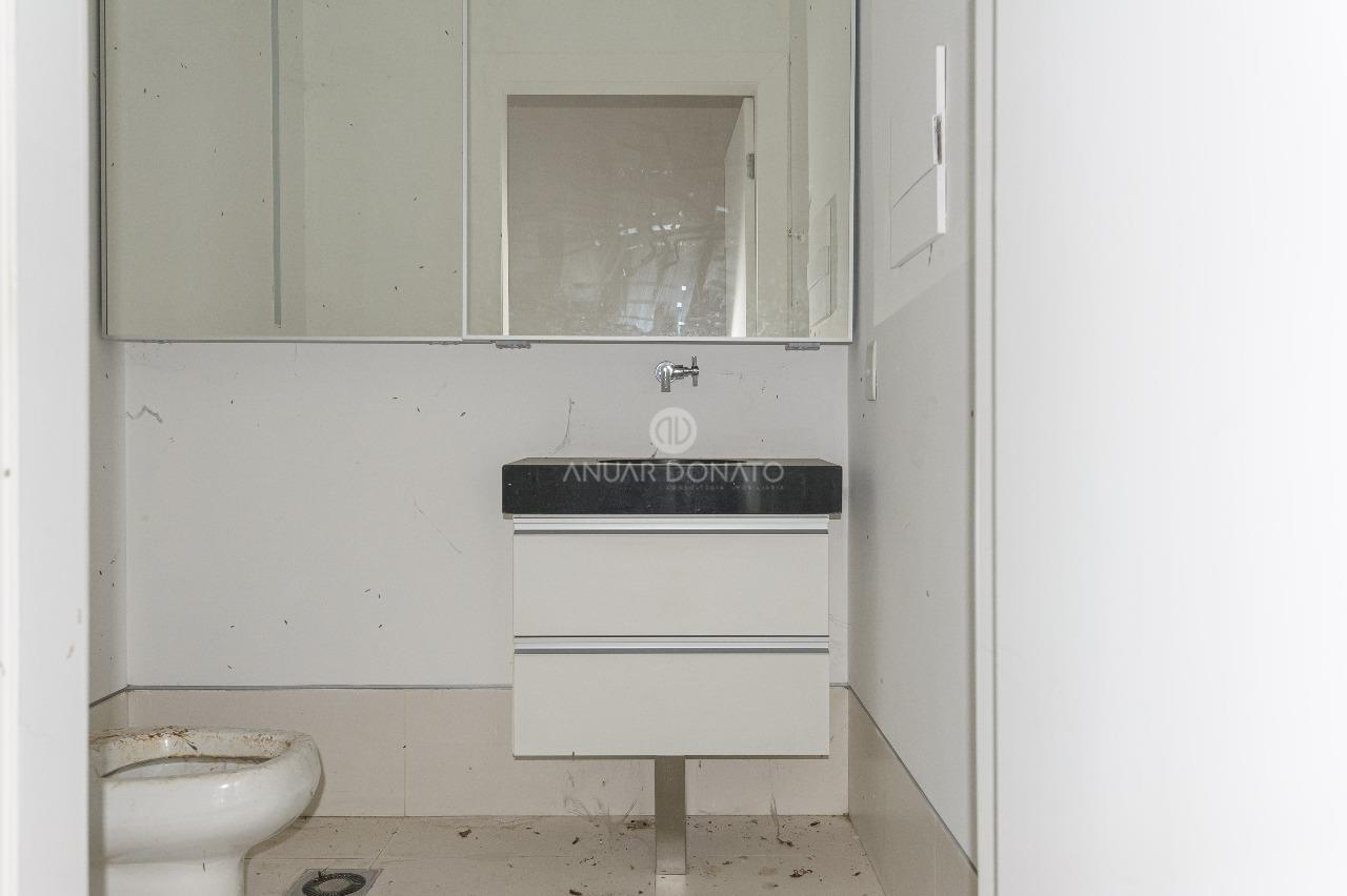 Loja com piso em porcelanato, fechamento em vidro temperado, banheiro com bancada em granito, piso em porcelanato e armário.