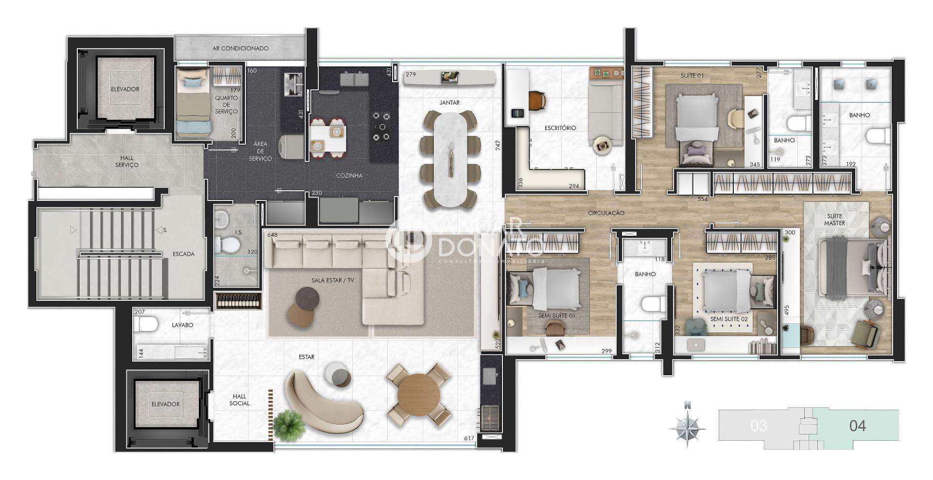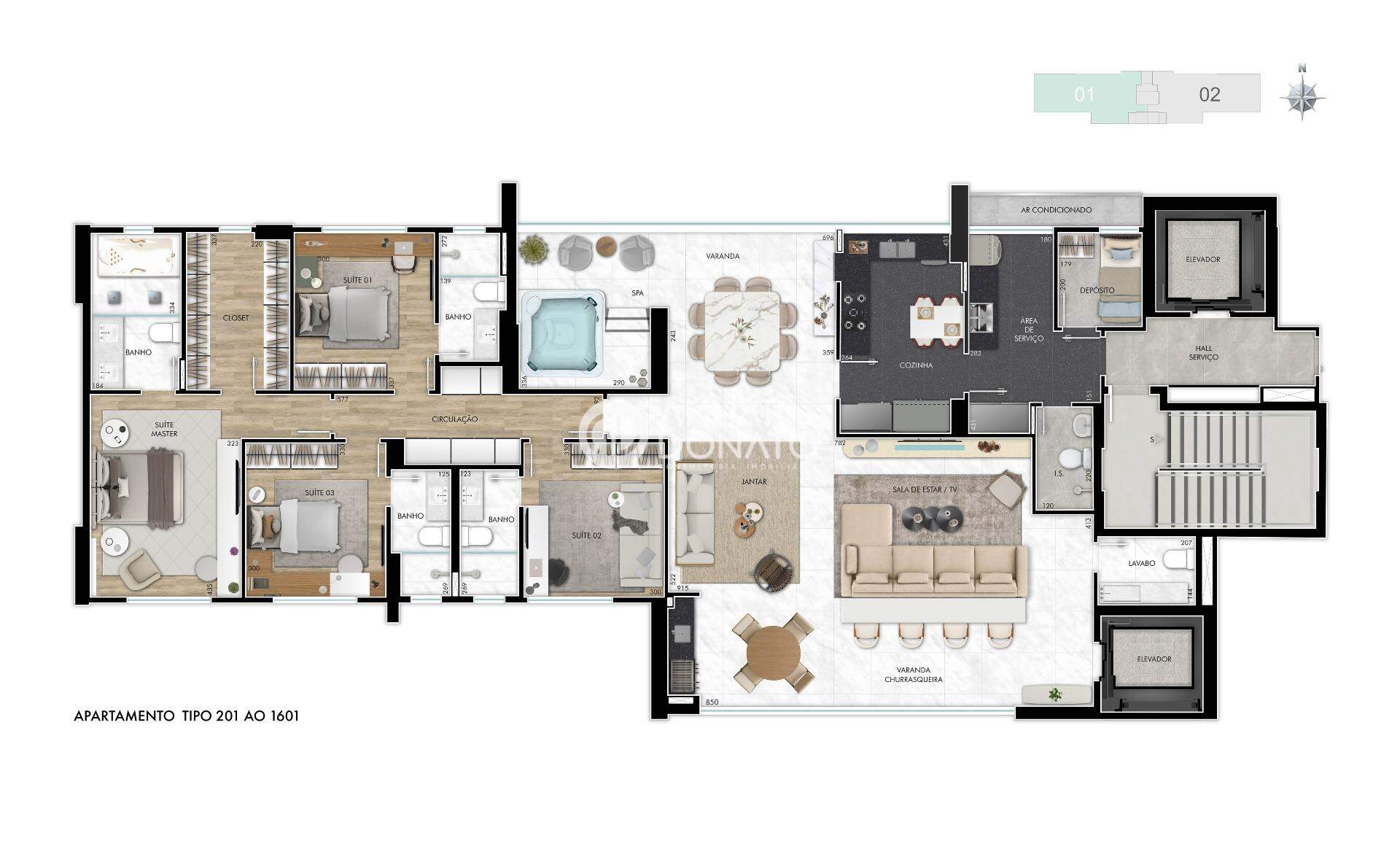 A Torre 1 receberá apartamentos de aproximadamente 183m², 2 suítes e 2 semi suítes. A Torre 2 receberá apartamentos de aproximadamente 213m², 4 suítes.